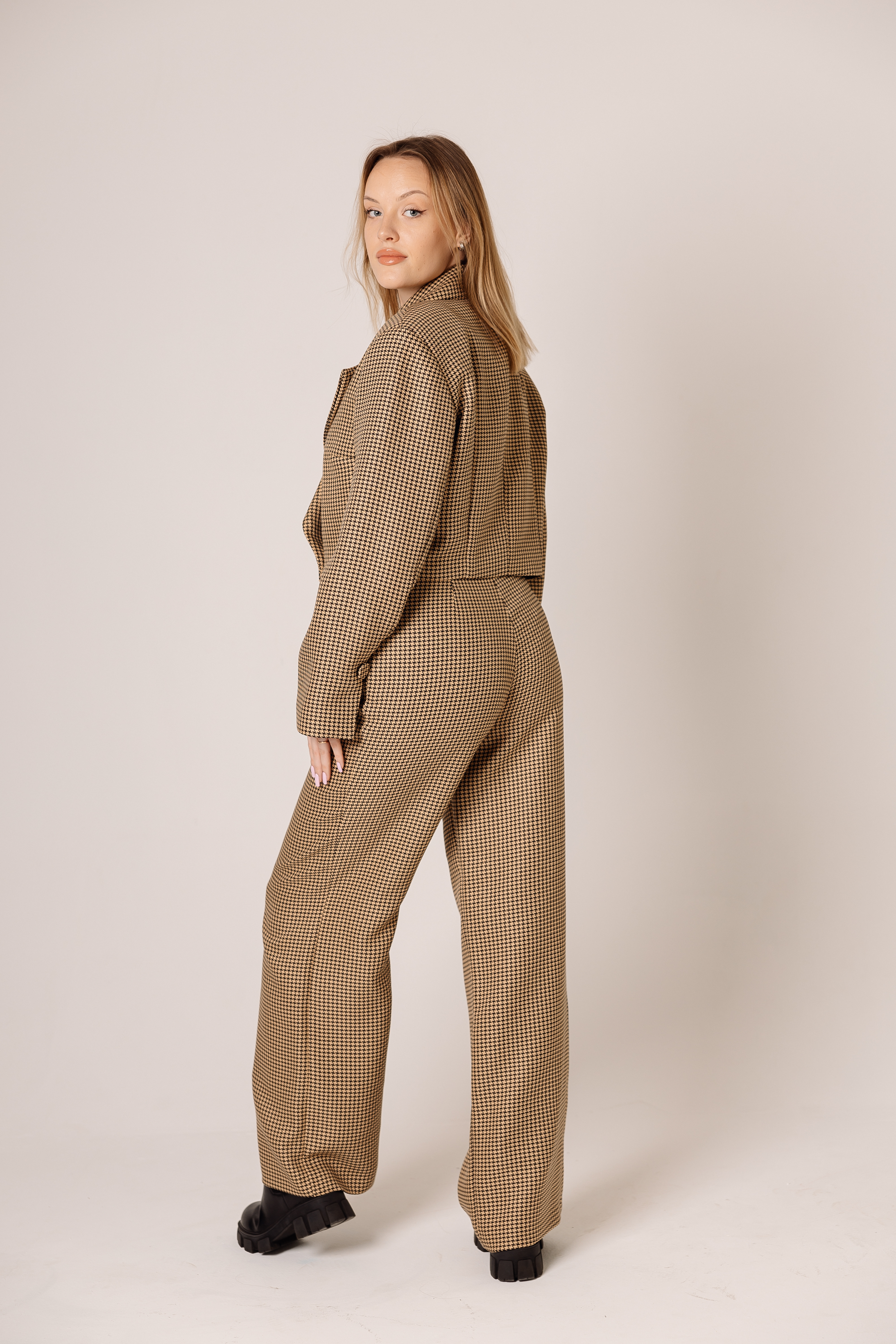 Przepiękny garnitur z krótką marynarką beżowy w czarną pepitkę. Model bardzo modny, posiada szerokie spodnie z zaszewkami. To świetny zakup, który później wykorzystasz na wiele sposób i okazji nosząc razem bądź osobno.