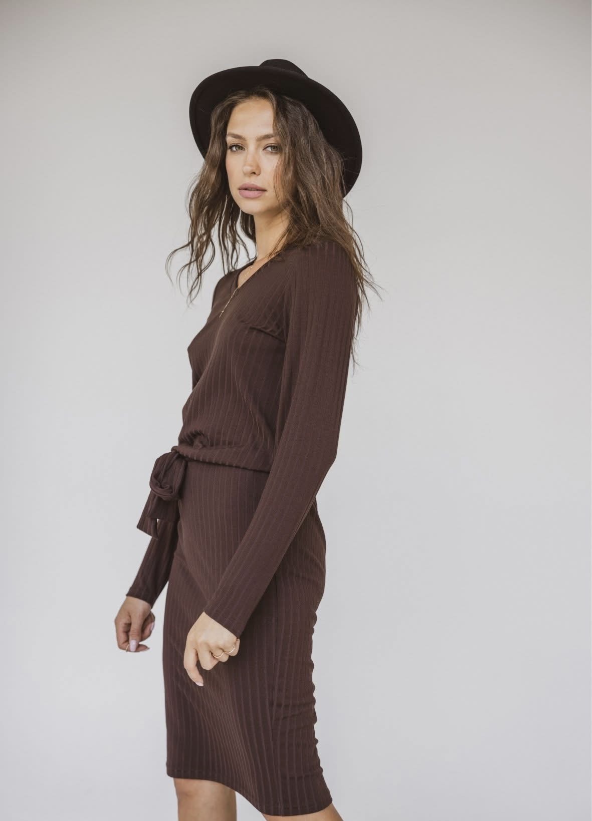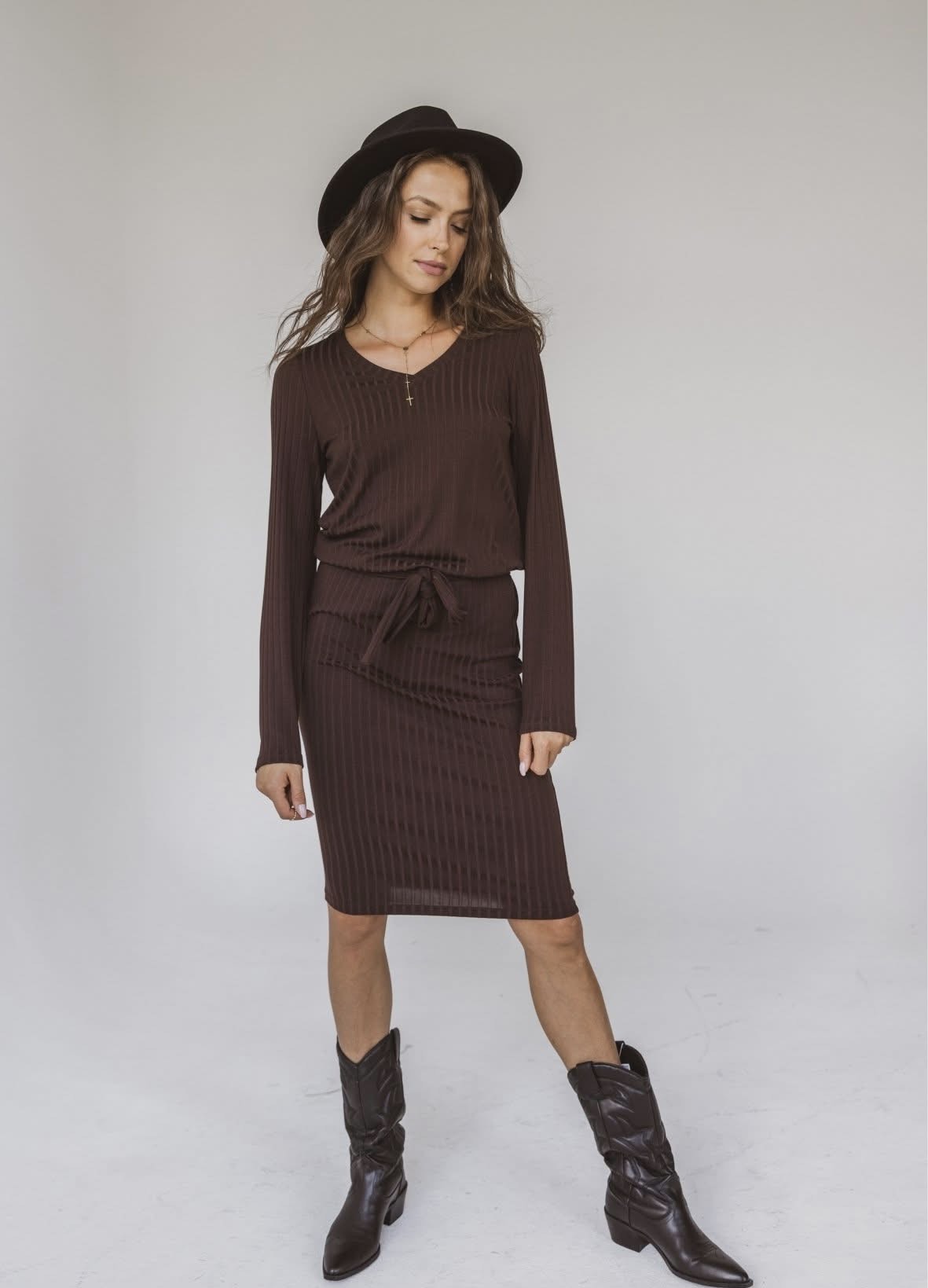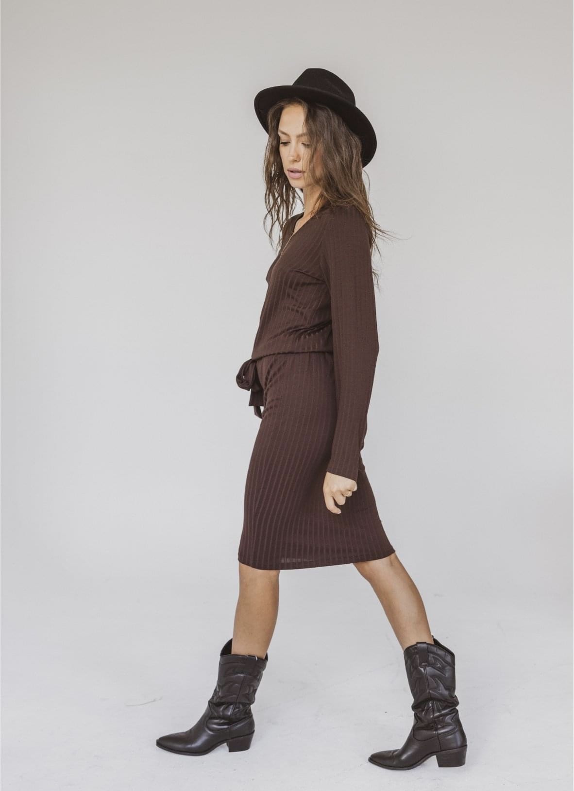 Czekoladowa sukienka dzianinowa Comfy, z przyjemnej prążkowanej tkaniny. Posiada pasek w talii, ale można nosić ją na kilka sposób. Bardzo wygodna do noszenia na co dzień bądź czy do eleganckich stylizacji.